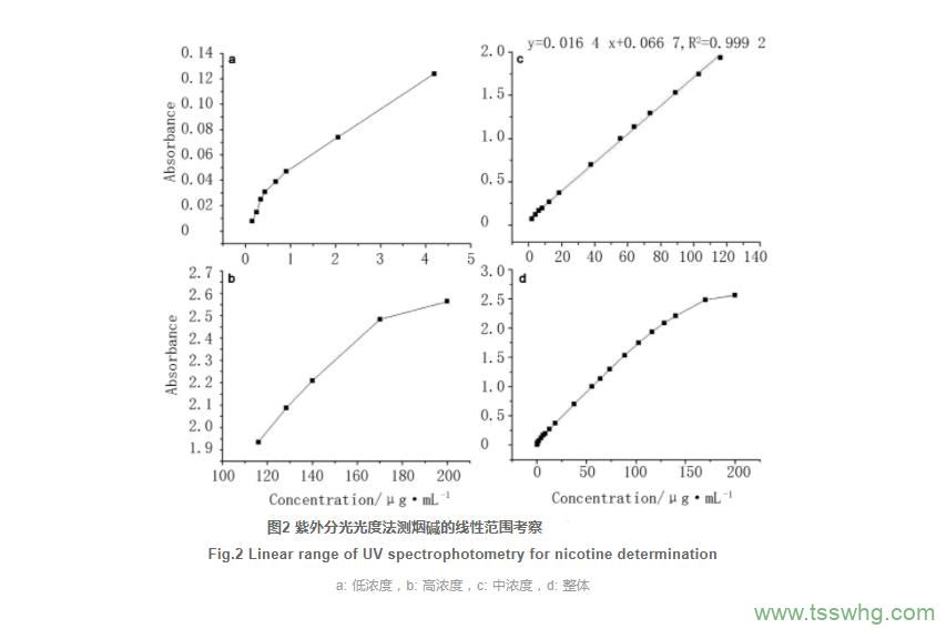 由圖2a、b可知,在煙堿濃度小于0.909 μg/mL(吸光度為0.047)和濃度大于128.424 μg/mL(吸光度2.088),曲線有偏離趨勢(shì)。在中濃度范圍2.056(吸光度0.074)~116.080 μg/mL(吸光度1.935)其線性關(guān)系較好,R2為0.999 2,遠(yuǎn)遠(yuǎn)好于前人研究結(jié)果中的線性范圍0.167~0.671和0.2~0.8,線性范圍的大幅擴(kuò)展說明現(xiàn)今的紫外分光光度計(jì)性能有大幅提升。