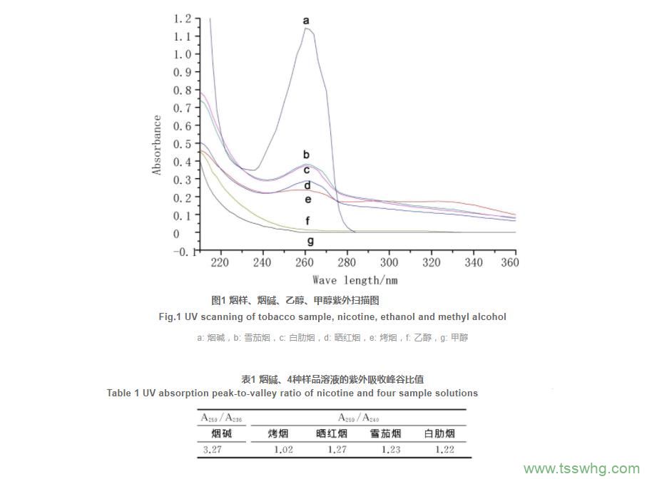 用紫外分光光度計(jì)對(duì)煙堿(乙腈溶解)、乙醇、甲醇、煙樣(5%甲醇萃取)在210 ~360 nm進(jìn)行掃描。