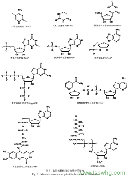 核酸一般指生物大分子的DNA(Deoxyribonucleicacid)和RNA(Ribonucleicacid),而核酸類(lèi)物質(zhì)(NAS,NucleicAcidSubstance)還包括核苷酸(NT,Nucleo—tide)及其衍生物等小分子物質(zhì)。構(gòu)成DNA的單體是脫氧核糖核苷酸(dNMP),有dAMP,dGMP,dCMP和dTMP四種;而構(gòu)成RNA的單體是核糖核苷酸(NMP),除AMP、GMP、CMP和UMP四種外,生物體中還有次黃嘌呤核苷酸(肌苷酸,IMP)和黃嘌呤核苷酸(XMP)等諸多衍生物。核苷酸可以分子內(nèi)環(huán)合生成環(huán)化核苷酸(如cAMP),或附加磷酸基團(tuán)生成核苷二磷酸、核苷三磷酸等。