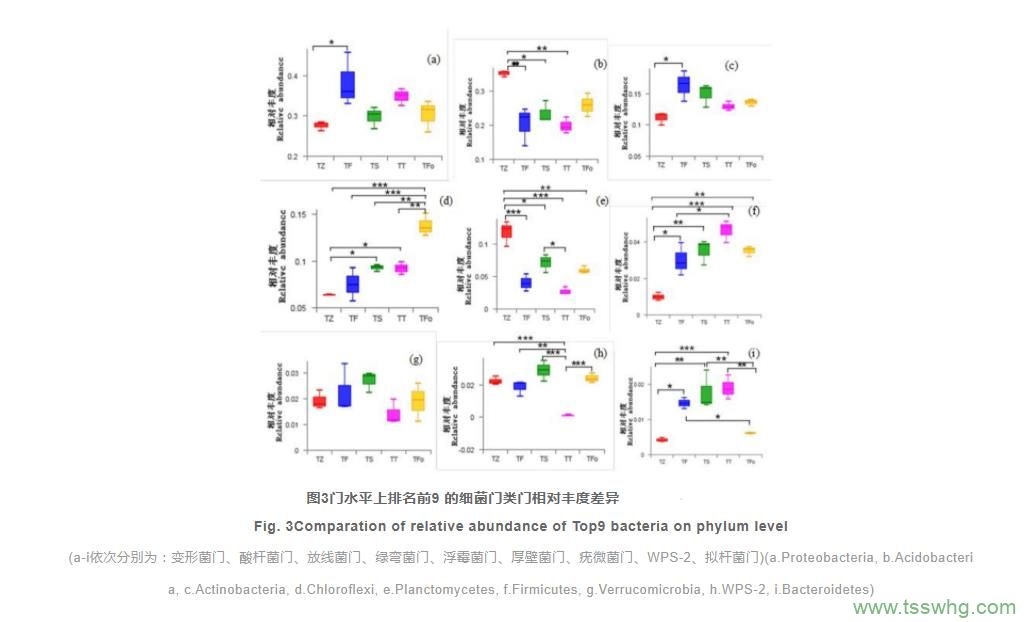 將不同連作年限土壤細(xì)菌優(yōu)勢(shì)門(mén)類排名前9的細(xì)菌及其豐度進(jìn)行方差分析,比較不同連作年限百香果種植土壤細(xì)菌群落組成差異,結(jié)果如圖3所示,9個(gè)優(yōu)勢(shì)菌門(mén)中,除疣微菌門(mén)的相對(duì)豐度(圖3 g)在不同連作年限土壤中無(wú)顯著差異外,其他8個(gè)門(mén)類菌群的相對(duì)豐度在不同年限連作年限土壤間均存在顯著的組間差異,特別是酸桿菌門(mén)、綠彎菌門(mén)、浮霉菌門(mén)、厚壁菌門(mén)和擬桿菌門(mén)(圖3 b,d,e,f,i)等相對(duì)豐度在撂荒地與百香果種植地之間存在顯著的差異,百香果種植可顯著降低土壤中酸桿菌門(mén)、浮霉菌門(mén)的相對(duì)豐度(圖3 b, e),同時(shí)可增加綠彎菌門(mén)、厚壁菌門(mén)和擬桿菌門(mén)(Bacteroidetes)的相對(duì)豐度(圖3 d, f, i),尤其是綠彎菌門(mén)隨連作年限的增加而增大的趨勢(shì),厚壁菌門(mén)和擬桿菌門(mén)在百香果種植的前三年業(yè)表現(xiàn)出隨種植年限增加而增大的趨勢(shì)。