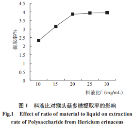 由圖1可知隨著料液比的增大,多糖得率整體呈增大趨勢,料液比在達(dá)到20mg/mL之后,多糖得率逐漸趨于平緩。