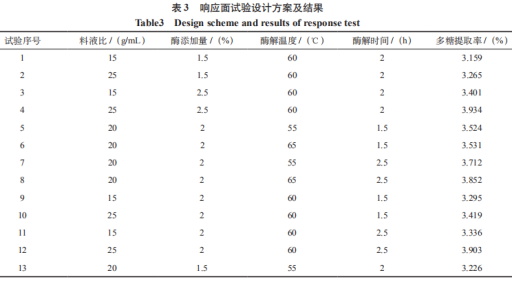 經(jīng)軟件預(yù)測分析得到纖維素酶提取猴頭菇多糖的最佳條件為:料液比23.97g/mL,酶添加量2.37%,酶解溫度61.90℃,酶解時間2.47h,在此條件下猴頭菇多糖提取率達(dá)到3.976%,根據(jù)實際試驗操作的方便與可能性,可將結(jié)果修正為料液比25g/mL,酶添加量2.5%,酶解溫度60℃,酶解時間2.5h。在此修正后的最佳條件下重復(fù)三次平行試驗,得到猴頭菇多糖提取率平均值為3.902%,相對誤差為1.86%,說明模型預(yù)測值與試驗實際值符合度較高,該回歸模型參數(shù)合理,能真實反映各因素對猴頭菇多糖提取的影響。