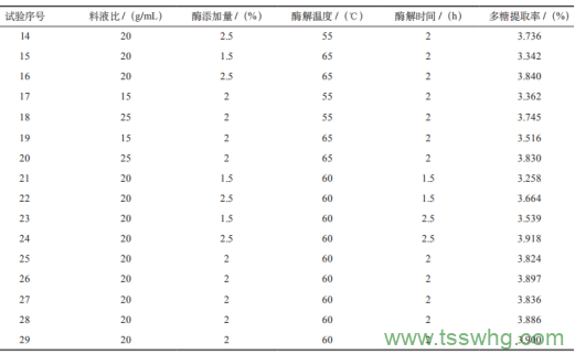 由圖4可知隨著酶解時間的增大,猴頭菇多糖得率呈增大趨勢,當(dāng)酶解2h以后,可能由于猴頭菇組織內(nèi)外多糖濃度達(dá)到平衡,或者溶出的多糖發(fā)生了部分降解,導(dǎo)致多糖得率呈現(xiàn)緩慢增大趨勢。