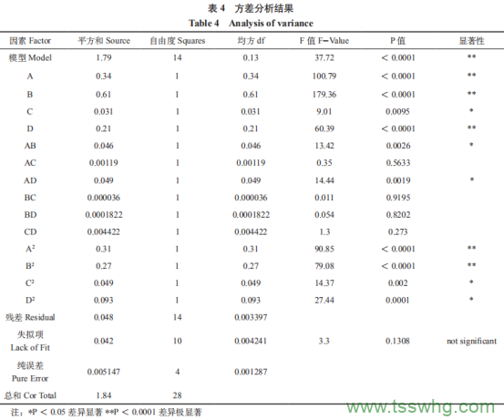 表4為回歸模型的方差分析結(jié)果,由結(jié)果看到該模型極顯著(P<0.001),失擬項p=0.1308>0.05,不顯著。該回歸模型的總決定系數(shù)為R2=0.9742,調(diào)整決定系數(shù)為RAd2=0.9483>0.8,說明該回歸模型與試驗數(shù)值的擬合程度比較高,能夠用該模型對猴頭菇多糖提取率進行分析與預(yù)測。