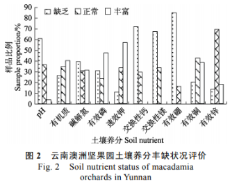 根據(jù)澳大利亞澳洲堅果園和《澳洲堅果優(yōu)質高效栽培技術》及其他相關文獻中的養(yǎng)分分級標準,分別對云南澳洲堅果果園土壤pH、有機質、水解性氮、有效磷、交換性鈣、交換性鎂、有效硼和有效銅、有效鋅養(yǎng)分含量進行養(yǎng)分豐缺狀況評價。具體劃分為適宜的參考指標如下:pH5.0~5.5,有機質20~30g/kg,堿解氮90~120mg/kg,有效磷10~20mg/kg,速效鉀100~150mg/kg,交換性鈣>500mg/kg,交換性鎂>100mg/kg,有效硼1.0~2.0mg/kg,有效銅1.0~1.8mg/kg,有效鋅1.0~3.0mg/kg。經(jīng)對表1中所包含的47個云南澳洲堅果園土壤養(yǎng)分測定數(shù)據(jù)計算可知(圖2),土壤pH值低于5.0和高于5.5的樣品比例分別占60%和4%;土壤有機質含量高于30g/kg和低于20g/kg的樣品比例占40%和26%;土壤堿解氮含量高于120g/kg和低于90mg/kg的樣品比例占31%和39%;土壤有效磷含量高于20g/kg和低于10mg/kg的樣品比例占47%和30%;土壤速效鉀含量高于150g/kg和低于100mg/kg的樣品比例占56%和11%;土壤交換性鈣含量處于適宜高于500mg/kg和低于500mg/kg的樣品比例占29%和71%;土壤交換性鎂含量處于適宜高于100mg/kg和低于100mg/kg的樣品比例占33%和67%;土壤有效硼處于1.0~2.0mg/kg適宜和低于1.0mg/kg的樣品比例占16%和84%,土壤有效銅處于1.0~1.8mg/kg適宜和高于1.8mg/kg的樣品比例分別占42%和38%,土壤有效鋅處于1.0~3.0mg/kg適宜和高于3.0mg/kg的樣品比例占69%和18%。從以上分析可知云南澳洲堅果園土壤偏酸,有機質含量較豐富,堿解氮、有效銅和有效鋅含量適宜,有效磷和速效鉀偏高,而交換性鈣鎂和有效硼偏低。