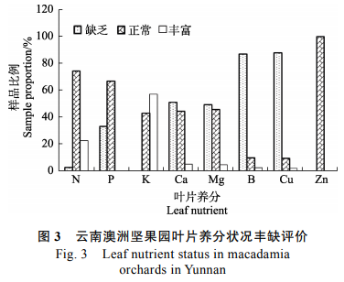 根據(jù)澳大利亞澳洲堅果葉片中的養(yǎng)分分級標準與營養(yǎng)元素狀況等,對云南澳洲堅果葉片營養(yǎng)進行養(yǎng)分豐缺狀況評價。葉片營養(yǎng)診斷處于適宜的參考指標如下:氮14~17g/kg,磷0.7~1.0g/kg,鉀4.0~8.0g/kg,鈣6.0~9.0g/kg,鎂0.8~1.2g/kg,硼40~80mg/kg,銅5~10mg/kg,鋅6~15mg/kg。經(jīng)對表2中所包含的47個云南澳洲堅果園葉片養(yǎng)分測定數(shù)據(jù)計算可知(圖3),葉片N養(yǎng)分含量處于適宜和豐富狀況的樣品比例占74%和23%;葉片P養(yǎng)分含量處于適宜和低于缺乏狀況的樣品比例占67%和33%;葉片K養(yǎng)分含量處于適宜和豐富狀況的樣品比例占43%和57%;葉片Ca養(yǎng)分含量處于適宜和缺乏狀況的樣品比例占44%和51%;葉片Mg養(yǎng)分含量處適宜和缺乏狀況的樣品比例占46%和49%;葉片B養(yǎng)分含量缺乏和適宜(含豐富)的樣品比例占87%和13%;銅養(yǎng)分含量缺乏和適宜(含豐富)的樣品比例占88%和12%;Zn養(yǎng)分含量處于適宜的樣品比例占100%(圖3)。從以上分析可得出云南澳洲堅果園葉片N、P、K和Zn養(yǎng)分處于適宜或豐富狀況;Ca和Mg養(yǎng)分處于缺乏或適宜狀況;而B和Cu養(yǎng)分處于缺乏狀況。