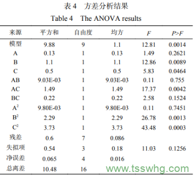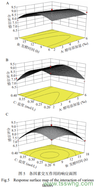 由表4可知,P=0.0014可知模型極顯著(P<0.01),失擬項(xiàng)P=0.1256,差異不顯著(P>0.05),決定系數(shù)R2=0.9428。各因素對(duì)感官評(píng)分的影響依次為B(發(fā)酵時(shí)間)>C(鹽度)>A(酵母添加量)。其中,模型的極顯著因子項(xiàng)(P<0.01)有B、AC、B2和C2,顯著的因子項(xiàng)(P<0.05)為C,可知感官評(píng)分受發(fā)酵時(shí)間的影響最大。