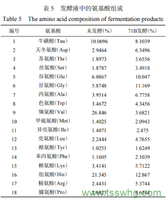 上述實(shí)驗(yàn)發(fā)現(xiàn)71B酵母發(fā)酵后發(fā)酵液的感官評(píng)分最高,這與其呈味氨基酸的變化密切相關(guān)。如表5所示,發(fā)酵后溶液中天冬氨酸(Asp)、谷氨酸(Glu)、甘氨酸(Gly)、丙氨酸(Ala)等幾種呈味氨基酸的含量均有明顯上升,其中Gly和Glu的含量相對(duì)較高,使發(fā)酵液呈現(xiàn)柔和的甜味和較強(qiáng)的鮮味。此外,纈氨酸(Val)、組氨酸(His)的含量顯著下降,可能是微生物生長繁殖利用,或是與發(fā)酵體系中的還原糖發(fā)生了美拉德反應(yīng),從而導(dǎo)致其含量降低。由于Val和His是苦味氨基酸,所以其含量的降低也有利于發(fā)酵液呈現(xiàn)較好的風(fēng)味。