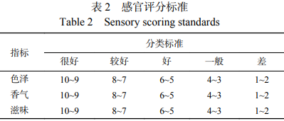 參考靳艷芬等對鮑復(fù)合調(diào)味品的感官評定方法,由10位評價(jià)人員組成評價(jià)小組對樣品進(jìn)行感官評定,評定采用1~10分制,取10名評價(jià)人員的平均分?jǐn)?shù)為最終結(jié)果。感官評分參照調(diào)味料行業(yè)標(biāo)準(zhǔn),以總體可接受度為最終評價(jià)結(jié)果,從產(chǎn)品色澤、香氣、滋味(權(quán)重比為3:4:3)進(jìn)行感官評定,感官評分標(biāo)準(zhǔn)見表2。