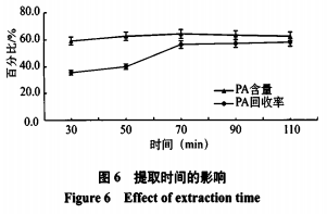 如圖6所示,隨著時(shí)間的延長,產(chǎn)品中PA的含量逐漸增加,于70min趨于平衡,而PA回收率卻在70min后增長變緩。當(dāng)提取時(shí)間達(dá)到70min,原料中的大部分PA已被酸醇萃取出來,PA回收率趨于平衡。提取時(shí)間超過70min,原料中的PE、PI等組分持續(xù)擴(kuò)散進(jìn)入酸醇之中,故PA含量逐漸下降,故理想的提取時(shí)間為70min。