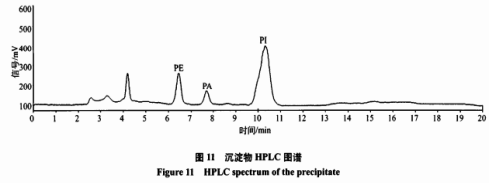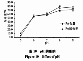 如圖10所示,隨著pH的升高,PA含量整體呈現(xiàn)逐級上升的趨勢,至pH=8時(shí)達(dá)到最高。主要原因在于,PA為弱酸性物質(zhì),在弱堿性條件下極易生成PA白色沉淀。蔣曉菲等的研究證實(shí)當(dāng)pH>5時(shí)PA溶液中出現(xiàn)白色絮狀樣的固體沉淀,同時(shí)部分PI與PE也會(huì)析出,本實(shí)驗(yàn)中亦觀察到此現(xiàn)象。取沉淀溶于流動(dòng)性中,經(jīng)HPLC分析表明沉淀為少量PA與大量PE、PI的混合物。由于PA與PE、PI所帶電荷不同,PA帶有兩個(gè)負(fù)電荷,故在pH<6時(shí)不易沉淀,優(yōu)先沉淀下來的是帶有負(fù)電荷較少的PE與PI。當(dāng)pH較低時(shí),PA生成量有限,故沉淀中PA的含量和回收率都極低,大部分的PA仍然溶解在酸醇中,而隨著pH的增大,PA開始沉淀DTI。當(dāng)pH>8后,PI和PE沉淀過多,故PA的含量有所下降。故最佳方法為先調(diào)節(jié)pH=5濾去雜質(zhì),后調(diào)節(jié)pH=8沉淀PA。
