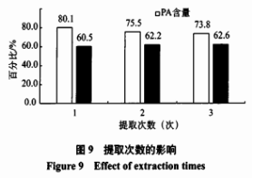 在料液比l:30、酸醇比1.2:100、提取時(shí)間70min、提取溫度45℃、沉淀pH=7的條件下,考察提取次數(shù)對PA提取效果的影響,結(jié)果見圖9。