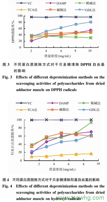 如圖3所示,未脫蛋白的DAMP與4種蛋白質(zhì)脫除方式得到的十貝多糖均有一定清除DPPH自由基的能力,但除了GDL組多糖,其他組多糖的DPPH自由基清除能力都不及VC。經(jīng)GDL法純化的多糖顯示出明顯的DPPH自由基清除能力,并呈劑量依賴關(guān)系。當(dāng)多糖質(zhì)量濃度為10mg/mL時(shí),GDL組多糖的DPPH自由基清除率為80.56%。不同蛋白脫除方式對干貝多糖清除羥基自由基能力的影響見圖4,稀堿組多糖顯示出明顯的羥基自由基清除能力,并呈劑量依賴關(guān)系。當(dāng)多糖質(zhì)量濃度為10mg/mL時(shí),稀堿組多糖的羥基自由基清除率為93.64%,比較接近VC的清除能力(10mg/mL,99.73%)。堿酶組及GDL組多糖的羥基自由基清除能力優(yōu)于TCA組多糖,可見,干貝多糖的抗氧化活性與多糖含量并不相關(guān),而是與單糖組成、空間構(gòu)象等諸多因素有關(guān)。