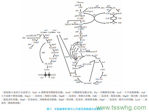 賴氨酸的主要生產(chǎn)方法有抽提法、化學(xué)合成法、酶法和發(fā)酵法。1960年日本首先以玉米為原料利用微生物發(fā)酵生產(chǎn)賴氨酸。由于微生物發(fā)酵法較其他生產(chǎn)方法有明顯優(yōu)勢,發(fā)酵法逐漸成為賴氨酸主要的生產(chǎn)方法。當(dāng)前,賴氨酸最主要的生產(chǎn)菌株有谷氨酸棒桿菌和大腸桿菌,菌種是發(fā)酵產(chǎn)業(yè)的核心,其生產(chǎn)性能是影響企業(yè)整體技術(shù)水平的關(guān)鍵因素。谷氨酸棒桿菌是最早用于工業(yè)發(fā)酵生產(chǎn)賴氨酸的菌種,早期主要利用隨機(jī)誘變育種技術(shù)。1960年日本首先利用紫外誘變技術(shù)獲得谷氨酸棒桿菌營養(yǎng)缺陷型突變體。隨著研究的深入,谷氨酸棒桿菌的中心代謝及賴氨酸合成途徑逐漸被解析(圖2)。利用分子生物學(xué)和基因工程手段,德國贏創(chuàng)德固賽、韓國希杰、日本協(xié)和發(fā)酵等公司都對(duì)產(chǎn)賴氨酸的谷氨酸棒桿菌進(jìn)行了大量全面的基因改造。