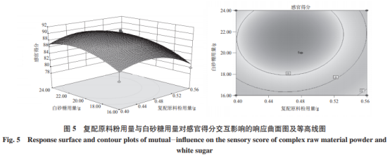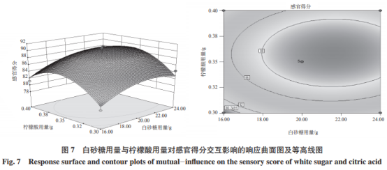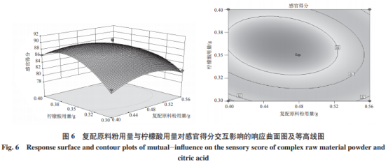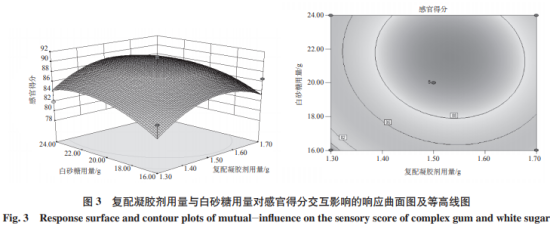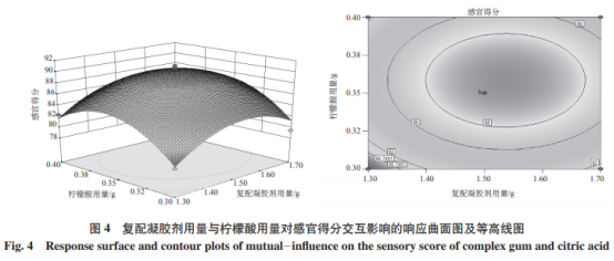 在固定復(fù)配凝膠劑和復(fù)配原料粉比例的基礎(chǔ)上,應(yīng)用Design-Expert8.0.6.1軟件對(duì)復(fù)配凝膠劑用量、復(fù)配原料粉用量、白砂糖用量、檸檬酸用量4個(gè)影響因素進(jìn)行Box-Behnken設(shè)計(jì)并分析,得到玫瑰山楂軟糖最佳配方為:復(fù)配凝膠劑(瓊脂∶卡拉膠=2∶3)用量1.53g,復(fù)配原料粉(玫瑰粉∶山楂粉=3∶2)用量0.46g,白砂糖用量21.48g,檸檬酸用量0.36g。