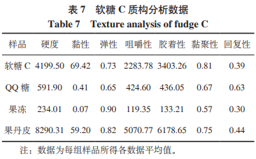 為直觀對(duì)比分析所得的質(zhì)構(gòu)特性數(shù)據(jù),除了樣品的測(cè)定以外,增加了對(duì)市售QQ糖、果凍(喜之郎)、果丹皮的質(zhì)構(gòu)特性測(cè)定,結(jié)果如表7。