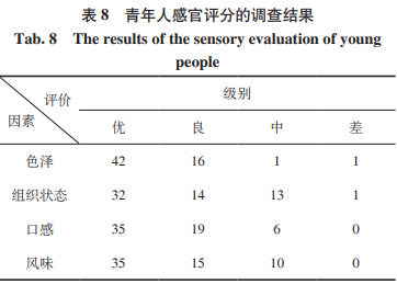 根據(jù)表3軟糖感官得分等級(jí)賦值,玫瑰山楂軟糖感官綜合評(píng)價(jià)得分T=Y·(95,85,70,30)T=88.565。表明若該產(chǎn)品投放市場(chǎng),青年消費(fèi)者的評(píng)價(jià)為良。