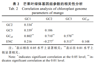 芒果葉綠體基因密碼子參數(shù)的相關(guān)分析顯示GCall和GC1、GC2、GC3極顯著相關(guān)(表2)。GC1和GC2、GC3顯著相關(guān),說明芒果葉綠體基因密碼子3個(gè)位置上的堿基組成相似。ENC值與GC2顯著負(fù)相關(guān),與GC3極顯著相關(guān),表明第2、3位上的堿基組成,特別是第3位對密碼子的偏好性影響較大。