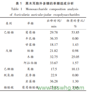 黑木耳胞外多糖經(jīng)過酸水解和衍生化后,利用HPLC分析其單糖組成。結(jié)果顯示,葡萄糖和木糖為其主要的單糖組分(物質(zhì)的量比為53.85%和25.05%),還有少量的甘露糖、果糖、巖藻糖、阿拉伯糖和葡萄糖醛酸(表1)。與紅外光譜分析結(jié)果一致,黑木耳胞外多糖是由多種單糖組分構(gòu)成的雜合多糖。