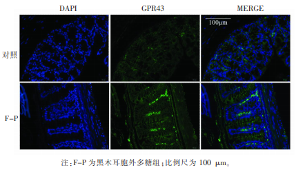 GPR43是一種特異性短鏈脂肪酸受體,它可以通過介導(dǎo)短鏈脂肪酸,在調(diào)控脂類代謝和免疫反應(yīng)等生物學(xué)過程以及在動物腸道對營養(yǎng)物質(zhì)的吸收中發(fā)揮重要作用。本試驗對小鼠結(jié)腸石蠟切片進行GPR43免疫熒光檢測,結(jié)果顯示胞外多糖組小鼠結(jié)腸GPR43的表達明顯高于對照組。