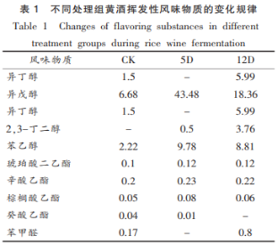 黃酒的風(fēng)味成分非常豐富,包括醇類(lèi)、酯類(lèi)、酸類(lèi)、醛類(lèi)及羰基化合物等。表1選取了幾種具有代表性的醇酯類(lèi)物質(zhì)進(jìn)行定性分析比較,以揮發(fā)性風(fēng)味物質(zhì)的總含量作為1,各成分含量為該成分與總含量的峰面積比值。當(dāng)添加OTC酶后,黃酒發(fā)酵產(chǎn)品中的主要風(fēng)味物質(zhì)組成如表1所示,其中苯乙醇和異戊醇的含量較高,苯乙醇具有清甜的玫瑰花香,是一種重要的風(fēng)味物質(zhì)。苯乙醇是由L-苯丙氨酸轉(zhuǎn)化而來(lái),主要通過(guò)酵母的氨基酸代謝或者糖類(lèi)的合成。從表中可以看出,對(duì)幾種主要的醇類(lèi),試驗(yàn)組的相對(duì)含量均高于對(duì)照組,且試驗(yàn)組12D具有更良好的風(fēng)味特征。
