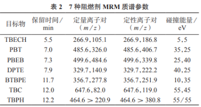 電離源:EI;電子能量:70eV;離子源溫度:230℃;四級(jí)桿溫度:150℃;溶劑延遲時(shí)間:2min;多反應(yīng)監(jiān)測(cè)模式:MRM模式,7種阻燃劑的MRM質(zhì)譜參數(shù)見表2。