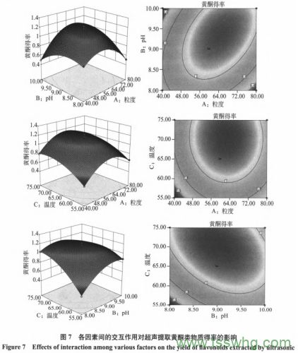 由方差分析可知,回歸模型極顯著(p<0.0001),提取苦蕎蛋白方程失擬項(xiàng)為0.5607>0.05;提取黃酮的失擬項(xiàng)為0.0894>0.05,二者都表明失擬項(xiàng)不顯著,且苦養(yǎng)蛋白的R2=0.9845,R2Adi=0.9646; 黃酮的R2=0.9829,R2Adi=0.9610,表明該模型與實(shí)際值擬合性很好,可以利用二者的回歸方程確定苦蕎蛋白和黃酮類物質(zhì)的最佳提取工藝條件。根據(jù)回歸模型的方差分析也表明對(duì)苦養(yǎng)蛋白影響極顯著的因素有A(粒度)、A2、B2、C2,影響顯著的因素有B(pH)、C(溫度),AB、AC、BC的交互影響均不顯著。對(duì)苦養(yǎng)黃酮類化合物影響極顯著的是C(溫度)、A2、B2,影響顯著的有AB、AC的交互作用,A(粒度)、B(pH)、BC、C2影響不顯著。從單因素水平分析可以得出,各個(gè)因素對(duì)苦蕎蛋白影響的主次順序?yàn)榱6龋緋H>溫度,對(duì)苦養(yǎng)黃酮影響的主次順序?yàn)闇囟龋玖6龋緋H。