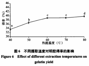 固定NaoH處理濃度為0.7%,處理2h;0.4%HCl處理1.5h,熱提時間為6h,不同提取溫度對明膠得率的影響結(jié)果見圖6。