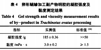 明膠的黏度和凝膠強(qiáng)度是反映明膠品質(zhì)的重要指標(biāo)。對卵形鯧鯵加工副產(chǎn)物提取的明膠產(chǎn)品的凝膠強(qiáng)度和黏度進(jìn)行了測定,結(jié)果見表4。