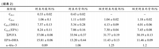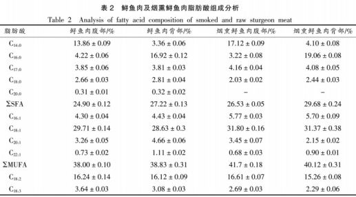 本研究共檢測到鱘魚肉中脂肪酸15種,其中飽和脂肪酸(SFA)5種,單不飽和脂肪酸(MUFA)4種,多不飽和脂肪酸(PUFA)6種;煙熏鱘魚肉中共檢測到脂肪酸13種,其中飽和脂肪酸4種,單不飽和脂肪酸4種,多不飽和脂肪酸5種,鱘魚煙熏過程脂肪酸組成的變化如表2所示。由表2可知,鱘魚腹部不飽和脂肪酸相對含量高于背部組織,其中腹部EPA和DHA相對含量也顯著高于背部。本次試驗結(jié)果與早期研究基本一致,說明鱘魚肉不飽和脂肪酸含量高,具有較高的營養(yǎng)價值和保健功能。煙熏后,鱘魚組織的多不飽和脂肪酸含量顯著下降,分別下降了5.31%(腹部)和3.75%(背部)。煙熏后鱘魚組織腹部和背部組織的不飽和脂肪酸相對含量差異不顯著,并且EPA和DHA相對含量相近。相關(guān)研究表明剛,不飽和脂肪酸具有熱不穩(wěn)定性,隨著不飽和程度的提高穩(wěn)定性降低,更易被氧化。因此,鱘魚腹部組織由于脂肪酸不飽和程度高,在受熱煙熏過程中更易氧化,所以在加工鱘魚時,鱘魚背部組織可以采用熱熏處理,而腹部組織更適宜采用冷熏等溫度較低、較為溫和的加工方式。