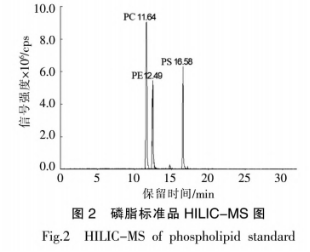 將3種磷脂標(biāo)品以1:1:1混合,配制混合標(biāo)準(zhǔn)溶液,測試保留時間。磷脂由親水性頭部與疏水性脂肪酸尾部組成,可以通過洗脫液梯度洗脫進行不同磷脂分子種分離,并通過提取圖譜上標(biāo)準(zhǔn)品的保留時問進行磷脂分子種鑒定。由圖2可以看出,本試驗方法可有效分離3類磷脂分子種。在負離子模式中,PE和PS因去質(zhì)子化而以[M-H]–為特征離子,PC由于流動相中甲酸存在而以[M+CH3C001]–為特征離子。由圖2可知,PC、PE和PS的出峰時間分別為11.64,12.49min和16.58min。
