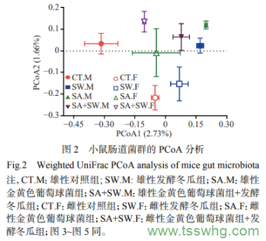 如圖1和圖2所示,發(fā)酵冬瓜和金黃色葡萄球菌顯著(P<0.05或P<0.01)提高了雄性小鼠腸道菌群的多樣性和豐富度。而雌性小鼠只有喂食發(fā)酵冬瓜后腸道菌群的多樣性和豐度顯著提高(P<0.01)。通過加權(quán)主坐標(biāo)分析(UniFracPCoA)發(fā)現(xiàn)喂食發(fā)酵冬瓜、金黃色葡萄球菌、金葡菌和發(fā)酵冬瓜的小鼠腸道菌群結(jié)構(gòu)與對(duì)照組小鼠的腸道菌群結(jié)構(gòu)存在明顯差異。