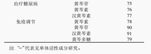 近年來,對黃芩的化學(xué)成分和藥理作用的研究越來越廣泛,并取得一定進(jìn)展,其中的一些活性成分也被發(fā)現(xiàn)。根據(jù)文獻(xiàn)信息對黃芩的藥理作用及其物質(zhì)基礎(chǔ)進(jìn)行總結(jié)分析,見表2。從分析結(jié)果可以看出,黃芩中的黃酮類成分是黃芩的主要有效成分。