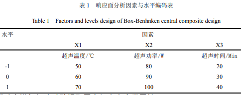在單因素試驗基礎上,根據Box-Behnken試驗設計原理,以X1(超聲溫度)、X2(超聲功率)、X3(超聲時間)為自變量,以黑變紅棗棗皮類黑精吸光度γ為響應值,設計三因素三水平的超聲波響應面分析試驗,試驗因素和水平的取值見表1,對響應面試驗結果所得數據采用Design-Expert8.0.6軟件進行分析和作圖。