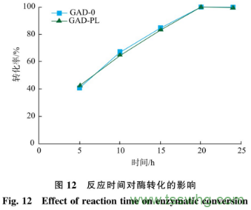 以100g/L的谷氨酸為底物,溶于去離子水中,加入預(yù)處理過的不同濕菌體,GAD-0和GAD-PL加入量分別為50U/g和40U/g,在40℃、150r/min的水浴搖床中反應(yīng)24h,反應(yīng)過程中,控制DH為5.0。反應(yīng)結(jié)束后進(jìn)行煮沸處理,12000r/min離心5min得上清液,適當(dāng)稀釋后用HPLC-OPA柱前衍生法進(jìn)行檢測(cè),結(jié)果見圖12。在0~20h,GAD-0和GAD-PL轉(zhuǎn)化合成GABA的產(chǎn)量隨時(shí)問延長(zhǎng)迅速增加,在20h時(shí)轉(zhuǎn)化率達(dá)到100%,之后隨著反應(yīng)進(jìn)行,轉(zhuǎn)化率不再發(fā)生變化。