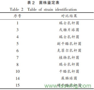 選取CLA含量最高的10株菌提取基因組DNA進(jìn)行16SrDNA鑒定,結(jié)果如圖3所示。篩選菌株均在1700bp左右有特異性條帶,送交公司測(cè)序。測(cè)序結(jié)果在NCBI中比對(duì)后如表2所示,其中瑞士乳桿菌3株,副干酪乳桿菌2株,戊糖片球菌、克菲爾乳桿菌、植物乳桿菌、屎腸球菌各1株,選擇CLA產(chǎn)量最高的植物乳桿菌,命名為HB-01測(cè)定其發(fā)酵性質(zhì)。