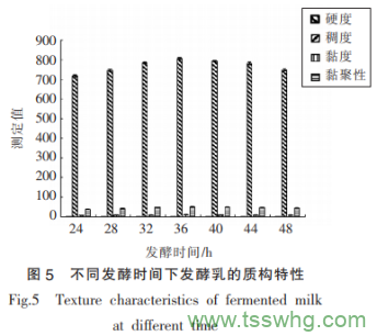 將植物乳桿菌接種純牛奶發(fā)酵進(jìn)行單因素試驗(yàn),所得發(fā)酵乳的質(zhì)構(gòu)變化如圖4~圖8所示。