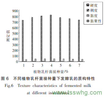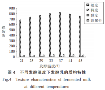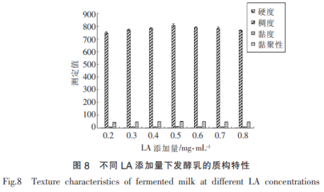 不同發(fā)酵溫度所得發(fā)酵乳的質(zhì)構(gòu)結(jié)果表明,硬度、黏度、膠著性和咀嚼性隨溫度的增加呈先上升后下降的趨勢(shì),在37℃時(shí)發(fā)酵乳的硬度最大(0.2300±0.0100)N。不同發(fā)酵時(shí)間所得發(fā)酵乳的質(zhì)構(gòu)結(jié)果表明,硬度、黏度、膠著性和咀嚼性的值在36h為最大值,硬度最大為(0.2467±0.0058)N,發(fā)酵性能更好。不同接種量所得發(fā)酵乳的質(zhì)構(gòu)結(jié)果表明,硬度、黏度、膠著性和咀嚼性的值在4%為最大值,硬度最大為(0.2567±0.0115)N。不同pH值所得發(fā)酵乳的質(zhì)構(gòu)結(jié)果表明,硬度、黏度、膠著性和咀嚼性的值隨pH值的變化不大,在pH值為6.5時(shí)硬度最大為(0.2200±0.0100)N。不同LA添加量所得發(fā)酵乳的質(zhì)構(gòu)結(jié)果表明,硬度、黏度、膠著性和咀嚼性的值隨LA添加量的變化不大,在0.5mg/mL時(shí)硬度最大為(0.2333±0.0115)N。