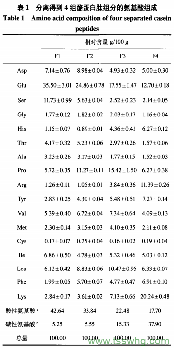 活性肽的帶電性質(zhì)在宏觀上反映了其氨基酸組成的差異。帶有負電荷的組分含有相對較多的酸性氨基酸,而帶有正電荷的組分含有相對較多的堿性氨基酸。采用柱前衍生法對分離得到的酪蛋白肽組分的氨基酸組成進行分析,結(jié)果如表1所示。F1-F3組分中酸性氨基酸含量高于堿性氨墓酸含量。其中,F(xiàn)1組分中酸性氨基酸(Asp和Glu)含量占總氨基酸含量的42.64%;F2組分中酸性氨基酸含量占33.84%;F3組分中堿性氨基酸(His、Arg、Lys)含量明顯高于F1和F2組分,達到15.33%。因此,F(xiàn)1、F2和F3可看做帶負電荷的組分,掌電勢較低。F4組分中堿性氨基酸含量高于酸性氨基酸含量,堿性氨基酸占氨基酸總數(shù)的37.90%。F4為帶正電荷組分,亭電勢較高。此外,有研究報道,具有結(jié)合二價金屬離子能力的氨基酸殘基包括Asp、Glu、His、Ser、Cys、Asn和Gin,這些氨基酸殘基在4組酪蛋白肽組分中的含量分別為55.5%、40.4%、29.4%和26.1%。再結(jié)合氨基酸組成分析可知,分離得到的4組酪蛋白肽組分都可以螯合鋅離子,并且螯合鋅的能力從F1組分到F4組分逐漸減弱。