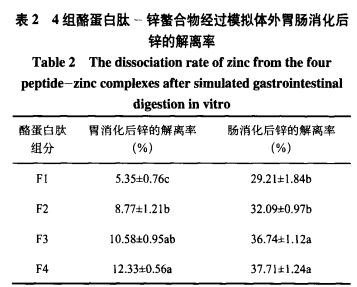 將肽一鋅螯合物在pH 2.0,37℃條件下經(jīng)胃蛋白酶消化2h,結(jié)果發(fā)現(xiàn)鋅離子在消化過程中會不同程度的從螯合物中釋放出來(表2)。從表中可以看出,在胃消化階段,F(xiàn)1組分中鋅離子的解離率最低為5.35%;其次為F2組分,為8.77%;F3和F4組分中鋅離子解離率相對較高,分別為10.58%和12.33%。有研究表明,金屬離子螯合物在酸性條件下較容易解離。此外,胃蛋白酶的水解作用也會導(dǎo)致鋅離子的釋放。在腸消化階段,鋅離子大量從螯合物中釋放出來。F1-F4組分中鋅離子的解離率分別為:29.21%、32.09%、36.74%和37.71%。雖然胰酶的水解作用促進(jìn)了鋅離子的解離,但是仍然可以看出隨著肽組分ζ電勢的增加,鋅的解離程度逐漸增加。