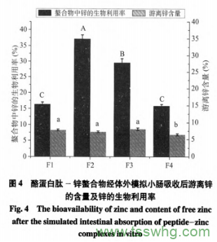 肽-鋅螯合物在胃腸階段的消化穩(wěn)定性對其吸收尤其重要。在胃消化階段,螯合物的穩(wěn)定性好,則鋅離子不易被植酸結(jié)合;在腸階段鋅離子的解離則有助于其吸收。本研究中ζ電勢較低的F1和F2組分在胃腸消化過程中鋅離子解離率比ζ電勢較高的F3和F4組分低,說明肽的表面負(fù)電荷有利于肽-鋅螯合物在胃腸消化過程中的穩(wěn)定性。
