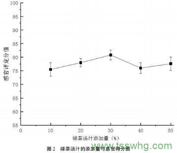 綠茶湯汁的添加量對感官如圖2所示,當(dāng)綠茶湯汁的添加量為10%時(shí),此時(shí)產(chǎn)品的茶味不明顯,茶香無法體現(xiàn)。而當(dāng)綠茶湯汁的添加量達(dá)到30%時(shí),所形成的風(fēng)味得到了評定人員較好的反響。此時(shí)茶香適宜、香味合適,而當(dāng)綠茶湯汁的添加量超過50%后,出現(xiàn)略微澀口的現(xiàn)象。