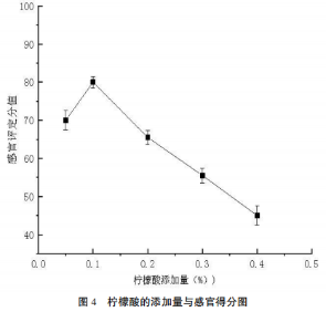 檸檬酸的添加量對白蘿卜綠茶飲料的整體風(fēng)味影響較大,如圖4所示。當(dāng)檸檬酸的添加量超過0.1%時(shí),產(chǎn)品的整體風(fēng)味偏酸,產(chǎn)品的其他重要風(fēng)味受到了嚴(yán)重的影響。而不加檸檬酸時(shí)的感官評定分?jǐn)?shù)甚至都高于檸檬酸添加量過多時(shí)的感官評定分?jǐn)?shù),所以白蘿卜綠茶飲料的整體風(fēng)味是不適合偏酸的。