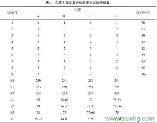 基于單因素試驗(yàn)分析,本產(chǎn)品的工藝研究將白蘿卜汁的添加量用A表示、綠茶湯汁的添加量用B表示、蔗糖的添加量用C表示、檸檬酸的添加量用D表示,以便于正交試驗(yàn)的進(jìn)行。正交實(shí)驗(yàn)因子水平見表3,正交實(shí)驗(yàn)結(jié)果如表4所示。通過正交試驗(yàn)分析表,由R值可以得出在白蘿卜綠茶復(fù)合飲料的調(diào)配過程中,4個因素對產(chǎn)品風(fēng)味的影響力度由強(qiáng)到弱為白蘿卜汁的添加量>綠茶湯汁的添加量>檸檬酸的添加量>蔗糖的添加量。而白蘿卜綠茶復(fù)合飲料的最佳配方為A2B3C1D2,即白蘿卜汁的添加量為25%,綠茶湯汁的添加量為40%,蔗糖的添加量為5%,檸檬酸的添加量為0.1%。加入0.15%的羧甲基纖維素鈉,均質(zhì)、殺菌后各自分分布均勻,靜止一周觀察無分層現(xiàn)象。