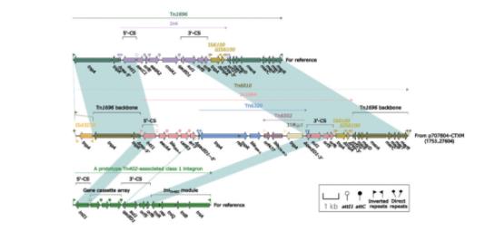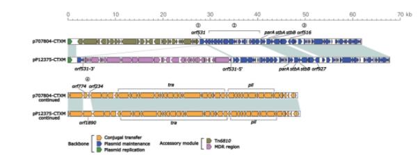 p707804?CTXM和pP12375?CTXM均只含一個(gè)MDR區(qū)。p707804?CTXM中Tn6810為新型轉(zhuǎn)座子,包含β?內(nèi)酰胺類耐藥基因blaCTX?M?3、blaOXA?1和blaTEM?1,氨基糖苷類耐藥基因aacA4,氯霉素耐藥基因catB3,利福平耐藥基因arr3以及磺胺類耐藥基因sul1。