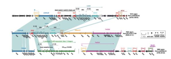 目前,產(chǎn)ESBL菌株的出現(xiàn)已較為普遍,移動元件包括質(zhì)粒攜帶β?內(nèi)酰胺耐藥基因是主要原因。其中β?內(nèi)酰胺類耐藥基因blaCTX?M通常存在于IncF、IncI、IncN、IncHI2和IncL/M等質(zhì)粒中,由插入序列ISEcp1或ISCR1介導(dǎo),形成如Tn6502(ISEcp1-blaCTX?M?3-orf477)或Tn6503(ISEcp1-blaCTX?M?14-IS903D)轉(zhuǎn)座單元,在blaCTX?M和其他ESBL基因轉(zhuǎn)座過程中扮演重要角色,在相同或不同種屬的腸桿菌科細(xì)菌間進(jìn)行水平轉(zhuǎn)移和傳播。ISEcp1屬于IS1380家族,與普通的插入序列不同,ISEcp1為單末端插入序列,僅靠單個(gè)插入序列即可介導(dǎo)其下游鄰近的耐藥基因進(jìn)行轉(zhuǎn)移,從而大大提高了耐藥基因轉(zhuǎn)移的概率。ISCR通過滾環(huán)復(fù)制,導(dǎo)致含有相鄰耐藥基因的環(huán)形DNA分子形成,從而插入到其他位置,常見的為插入到1型整合子3'?CS下游形成VR2區(qū)。