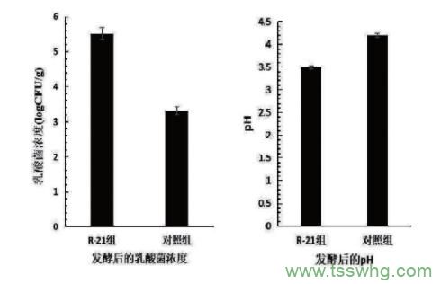 采用厭氧罐培養(yǎng)法檢測發(fā)酵120d后飼料中乳酸菌的活菌數(shù)對數(shù)值,使用筆式pH計(jì)檢測兩組發(fā)料飼料的pH。結(jié)果如圖2所示,添加植物乳桿菌R-21的青貯飼料中,其最終的乳酸菌活菌數(shù)對數(shù)值為5.51,比對照組高2.19;pH約為3.5,較對照組低0.7。表明植物乳桿菌R-21能顯著增加青貯飼料中乳酸菌活菌的終濃度,并降低其pH(P≤0.05)。乳酸菌濃度和pH是衡量青貯飼料優(yōu)劣的兩個(gè)重要指標(biāo)。一般情況下,乳酸菌濃度越高,其產(chǎn)酸能力越強(qiáng),越有利于維持飼料的生物穩(wěn)定性。乳酸菌是益生菌,有利于促進(jìn)動(dòng)物腸道健康,增強(qiáng)動(dòng)物非特異免疫力,預(yù)防與治療細(xì)菌性腹瀉,具有重要的應(yīng)用價(jià)值。