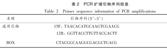 以細(xì)菌基因組DNA為模板,參考Silva等的方法,利用設(shè)計(jì)的BOX引物(引物序列見表2)進(jìn)行rep-PCR擴(kuò)增。待擴(kuò)增完成后,將PCR產(chǎn)物進(jìn)行1.5%的瓊脂糖凝膠電泳并在UV燈下觀察電泳結(jié)果。