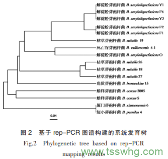 將校正并拼接后的序列在GenBank中進(jìn)行同源序列的搜索,由rep-PCR得到的大致條帶情況,從差異估計(jì)出發(fā),采用層次UPGMA法(UnweightedPair-GroupMeanAverage),根據(jù)供試菌株的rep-PCR擴(kuò)增條帶的大小,采用二進(jìn)制方法,生成系統(tǒng)發(fā)育樹。