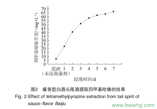 本研究將高含量四甲基吡嗪的菌劑浸泡在頭尾酒中7 d,四甲基吡嗪浸提效果見圖2。由圖2可知,隨著浸泡時(shí)間的增加,尾酒中四甲基吡嗪含量逐漸增加,從最初頭尾酒中僅含有6.70 mg/L增加到第7天時(shí)的66.35 mg/L,說明四甲基吡嗪具有較好的醇溶性,利用浸提的方法能夠使得頭尾酒中富集高含量的四甲基吡嗪。